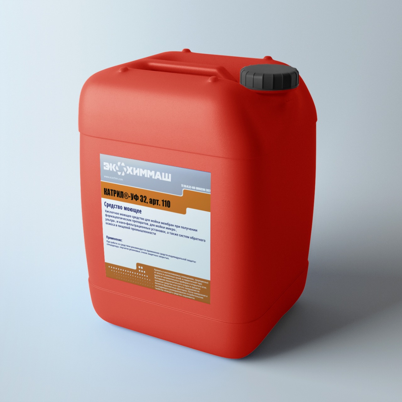 Катрил-УФ 32 представляет собой кислотное беспенное моющее средство для обработки мембранного оборудования. Содержит в составе смесь неорганических кислот (фосфорной и азотной),  комплексообразующие компоненты и функциональные добавки. Предназначен для мойки микро-, ультра- и нанофильтрационных установок, а также систем обратного осмоса в фармацевтической, молочной и пивобезалкогольной промышленности.